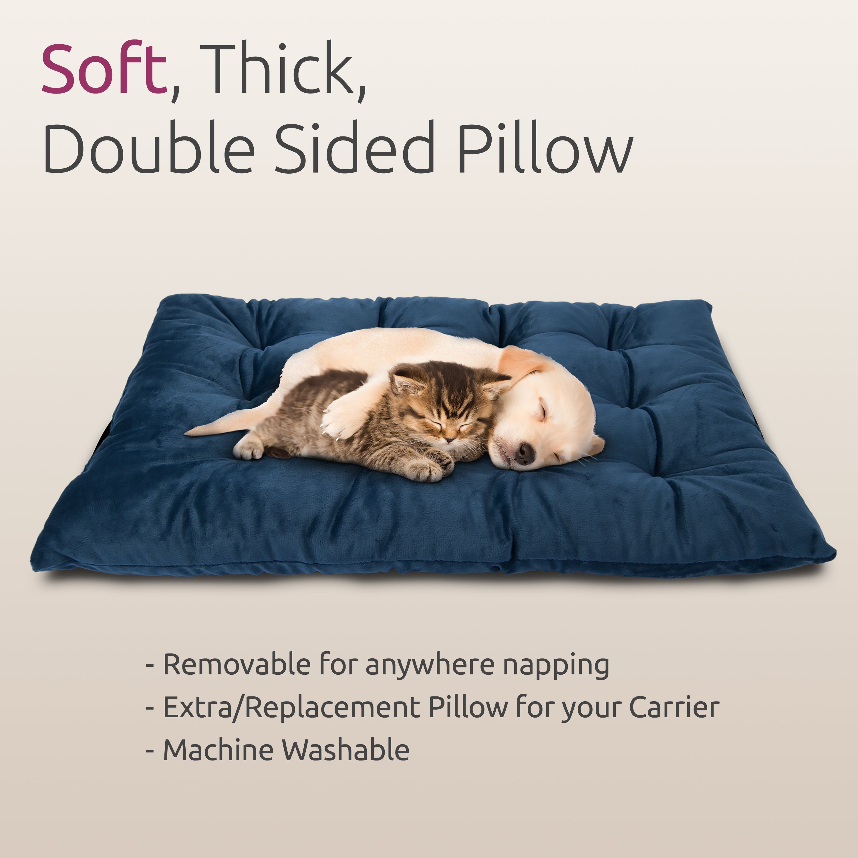 - A plush removable pillow makes your pet feel like royalty; it is double-sided, matches the carrier and is completely machine-washable