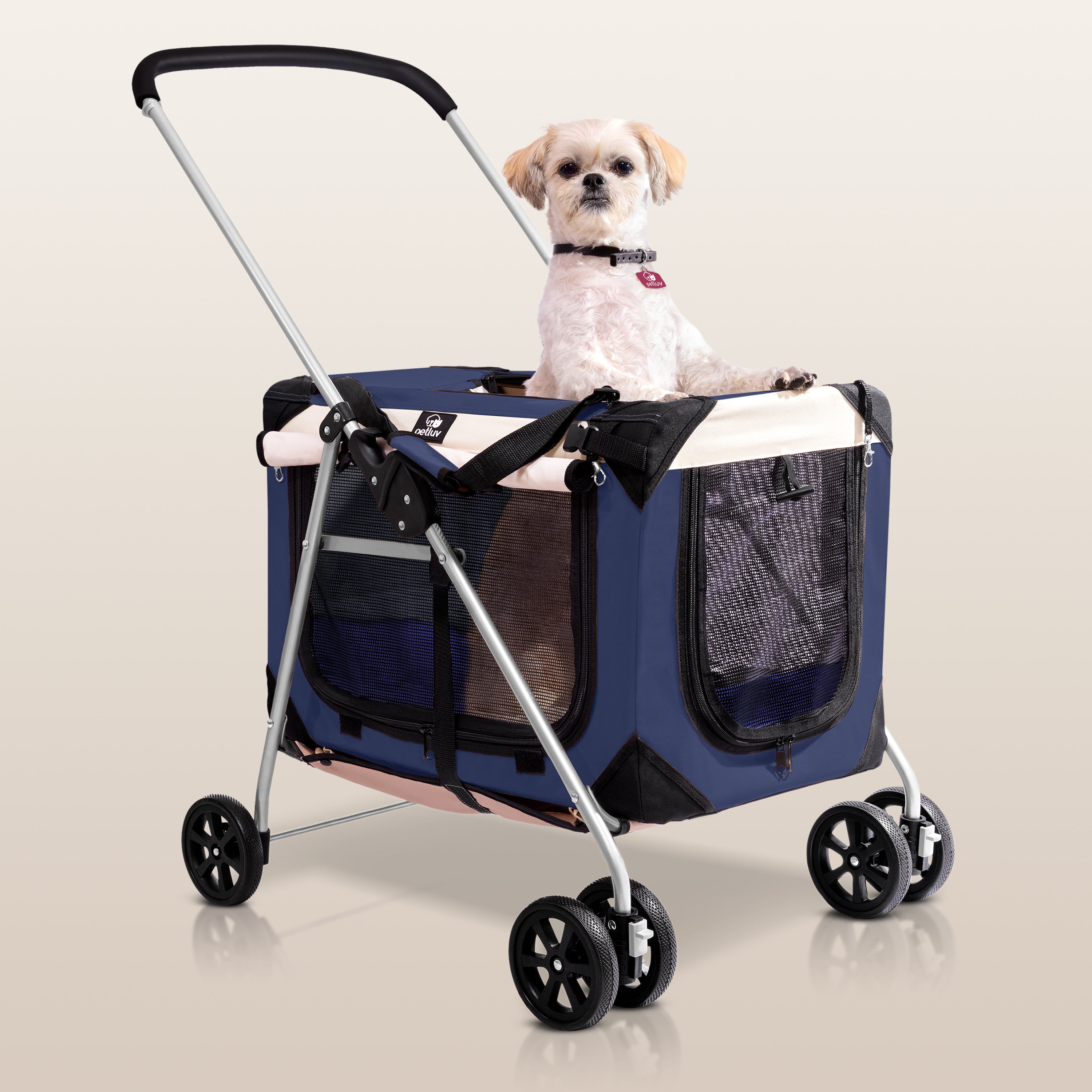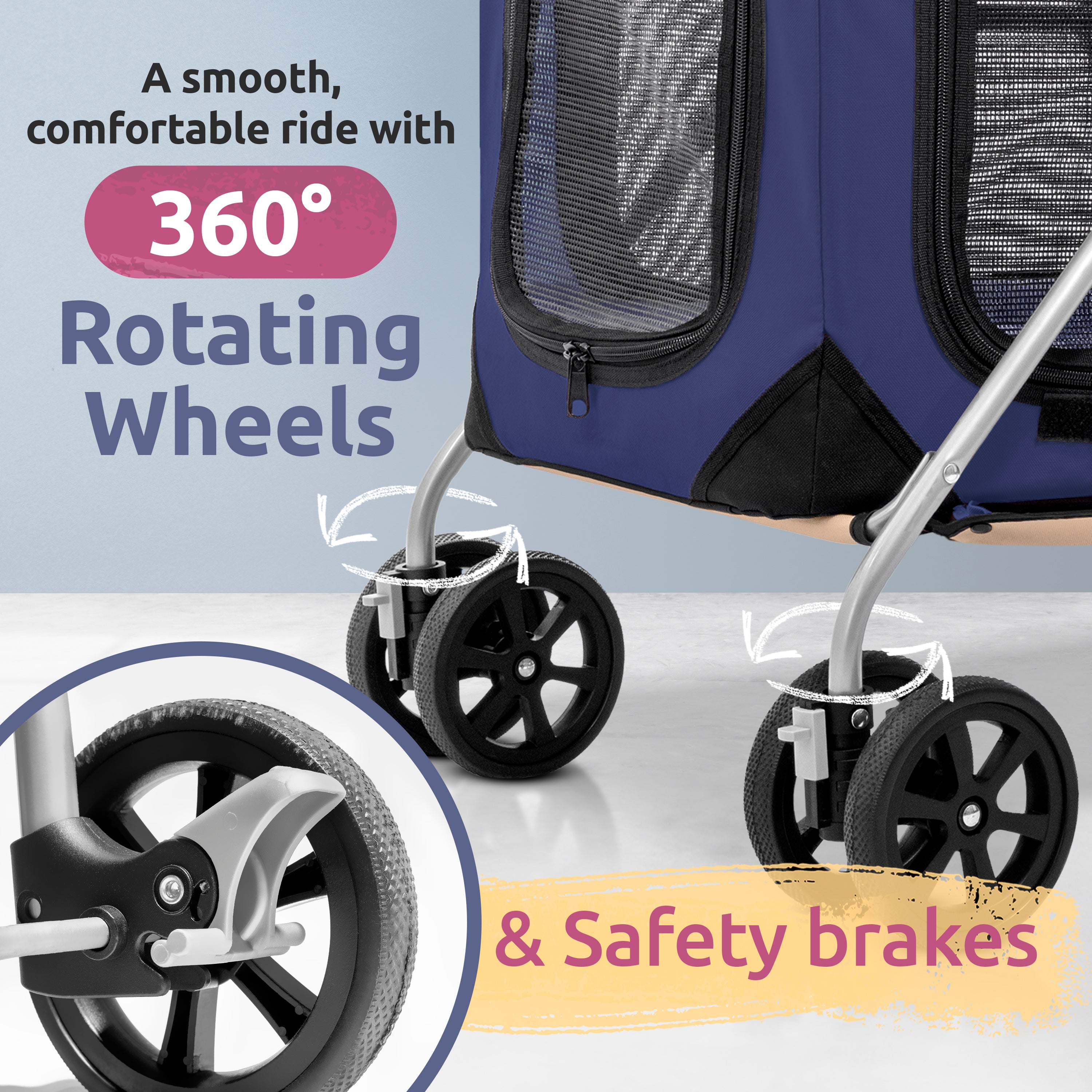 - 4 big wheels make it easy to steer on sidewalks, streets, dirt, or grass—all your pet’s favorite spots