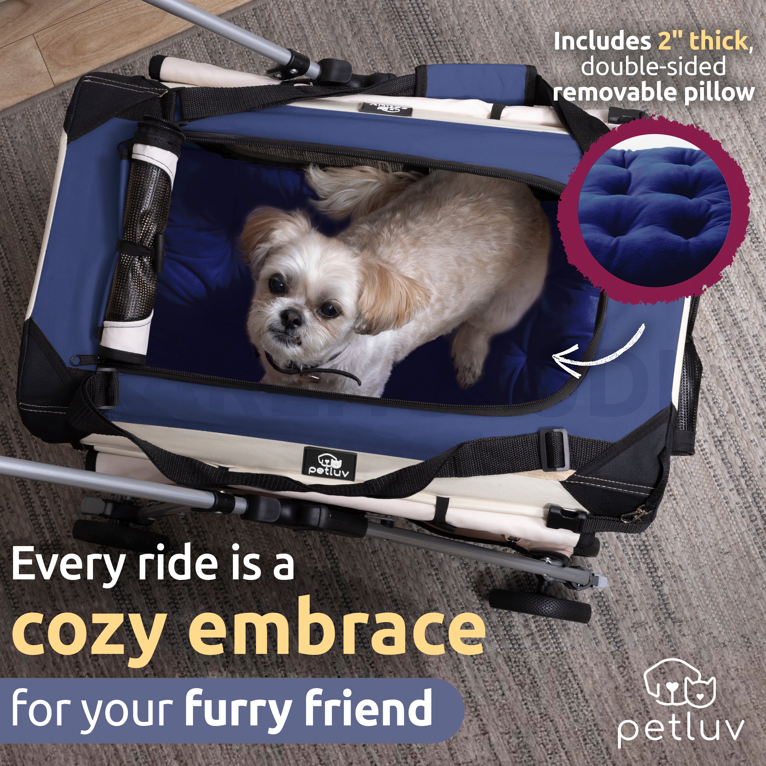Our PetLuv luxury 3-in-1 pet stroller is a cat & dog stroller, a soft-sided pet carrier & a travel crate combined to give your cat or dog the royal treatment every time you leave the house together. Anchored by our detachable premium soft-sided pet carrier, our pet stroller features our classic 2-inch-thick plush pillow, panoramic windows with roll-up mesh screens and solid privacy panels, locking zippers, seatbelt loops, a large storage pocket, and heavy-duty, wipe-clean materials designed to withstand your pet’s favorite adventures. Quickly attach the carrier to the stroller base and embark on your next outing in style!