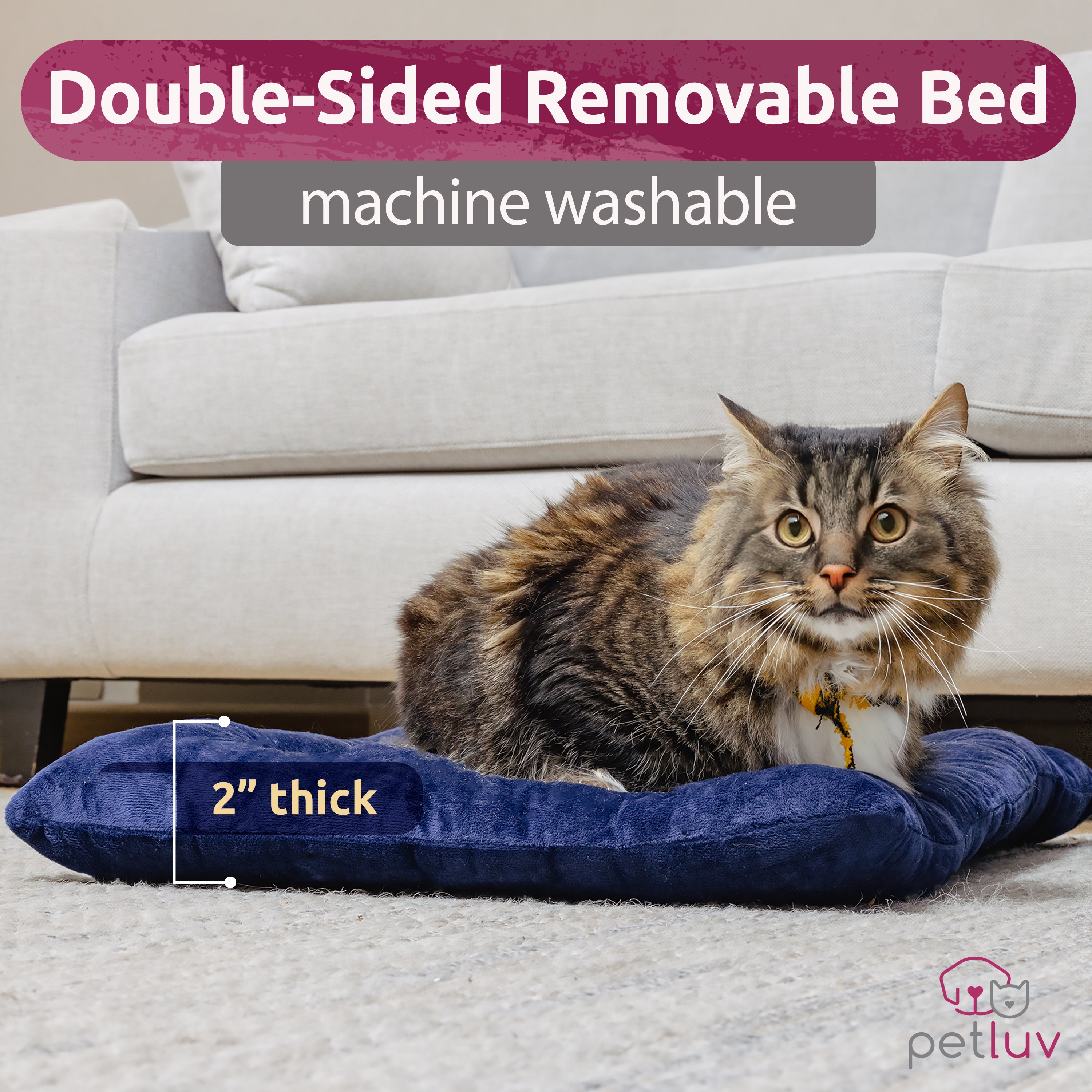 - Plush 2” thick, double-sided pillow that’s removable, washable, and as snuggly as your fur baby